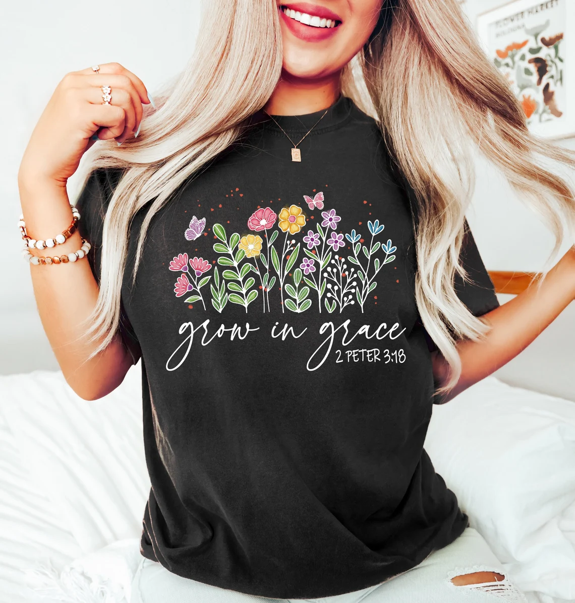 Celebrate spiritual growth with this Christian T Shirt for Women, inspired by 2 Peter 3:18 – Grow in Grace. Featuring a colorful floral design with butterflies, this shirt is a beautiful reminder to continue growing in faith and grace every day.